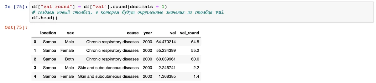 Теперь научимся добавлять столбцы. Например, добавим столбец, в котором будут храниться значения val, но только округленные до одной десятой.