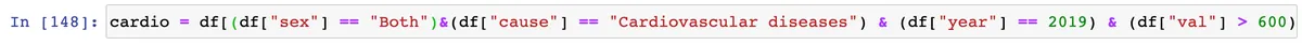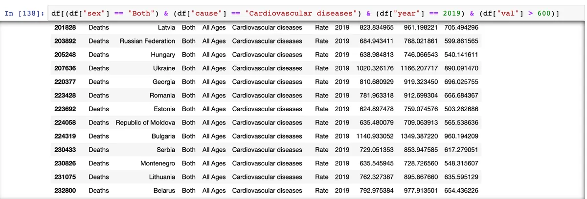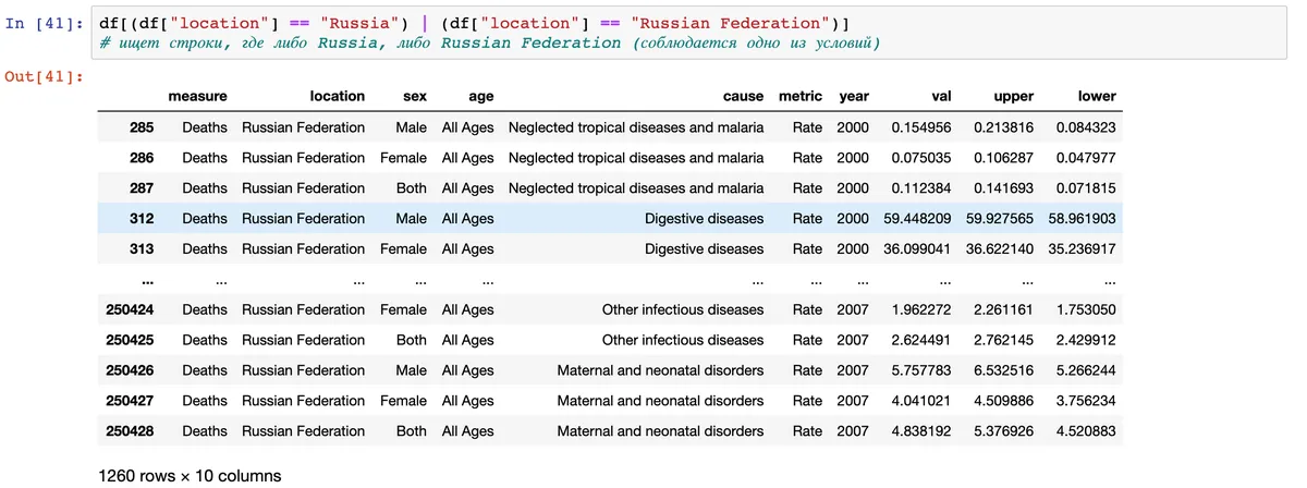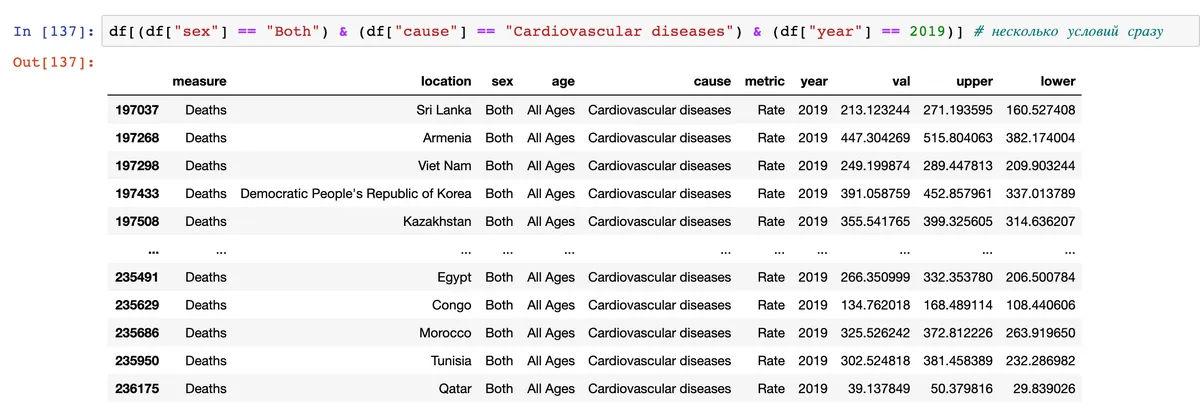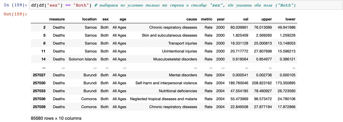 В Pandas очень удобно выбирать данные по условию. Например, нам нужны показатели смертности только для Both sexes, обоих полов.