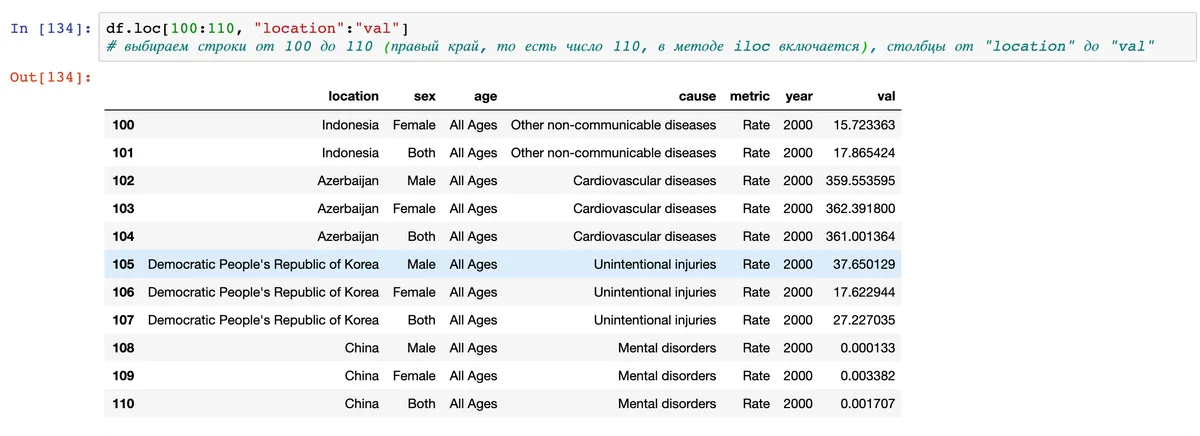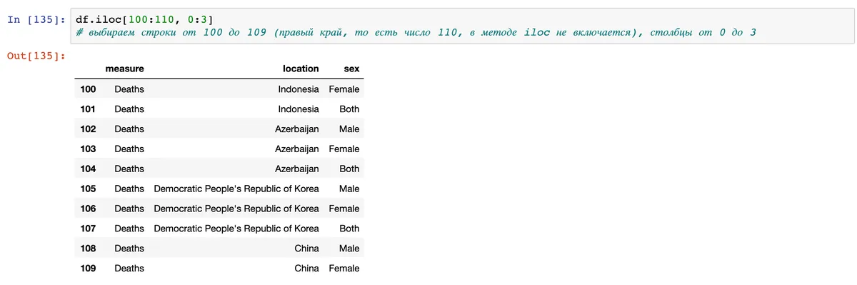 Важно: в методе loc включаются все указанные в условии числа, поэтому мы видим строку 110, а в iloc правый конец исключается (как в стандартных срезах в Python), поэтому последняя строка, которую мы видим — 109. Чтобы вывести на экран строки 100:110, нужно было бы указать df.iloc[100:111, 0:3].
