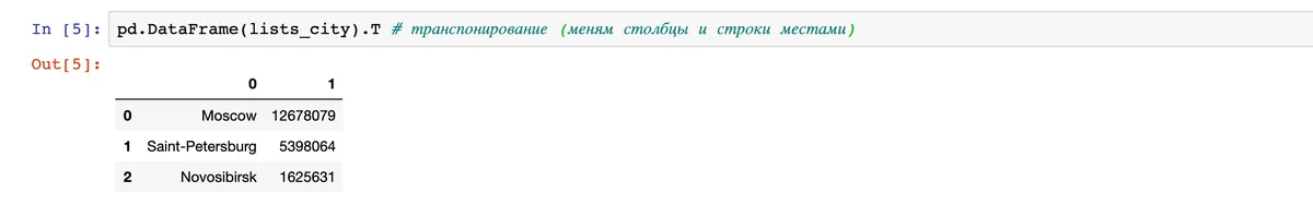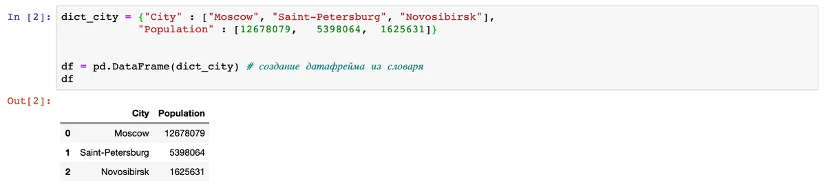 Создадим свой первый датафрейм для трех крупнейших городов России. Перед нами словарь, в котором ключами являются city и population, а значениями — списки с названиями этих городов и численностью населения, которая им соответствует.