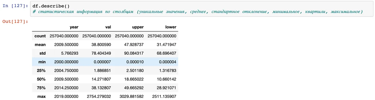 Метод describe дает статистику по числовым столбцам: среднее, максимум и минимум, квартили, стандартное отклонение.