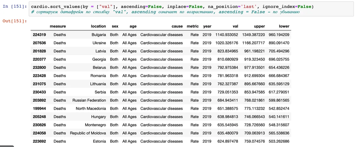 Мы видим страны с самой высокой смертностью от сердечно-сосудистых болезней. Cохраним результат в отдельный датафрейм и назовем его cardio.
