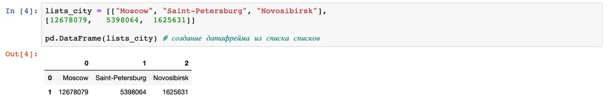 В Pandas данные представлены в виде датафрейма, или таблицы с данными. Её можно создать с нуля, например, из словарей, списков или кортежей.