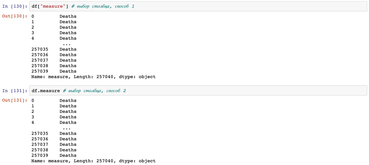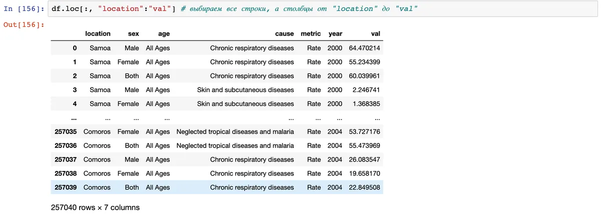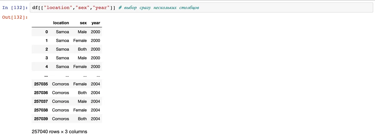 Ещё для выбора столбцов и строк существует методы loc и iloc. Loc — для выбора по названию, iloc — по индексу (порядковому номеру).