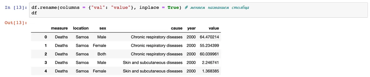 Переименовать столбцы тоже несложно. Переименуем, например, val в value.