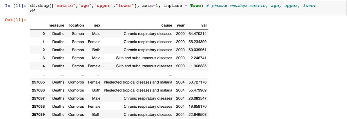 Видно, что значения в столбцах measure, metric, age одинаковые. Также мы не будем работать с столбцами lower и upper (нижняя оценка показателя смертности и высокая), поэтому их можно удалить. Для этого используем метод drop.