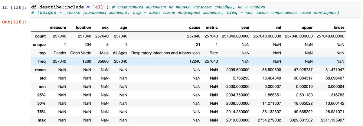 Тогда к таблице добавятся поля unique (сколько в столбце уникальных значений), top (какое значение встречается чаще всего) и freq (сколько раз встречается самое частое значение).