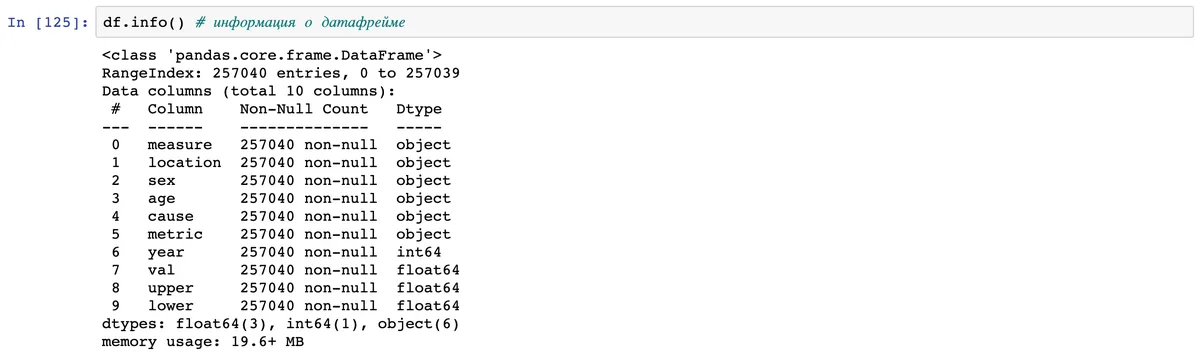 Метод df.info() дает описание датафрейма: сколько в нем строк и столбцов, какие типы данных содержатся, сколько не пустых значений (non-null), сколько памяти занимает.