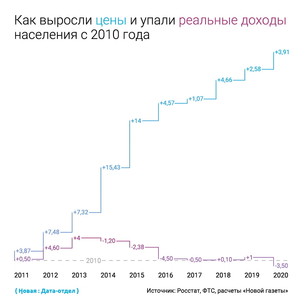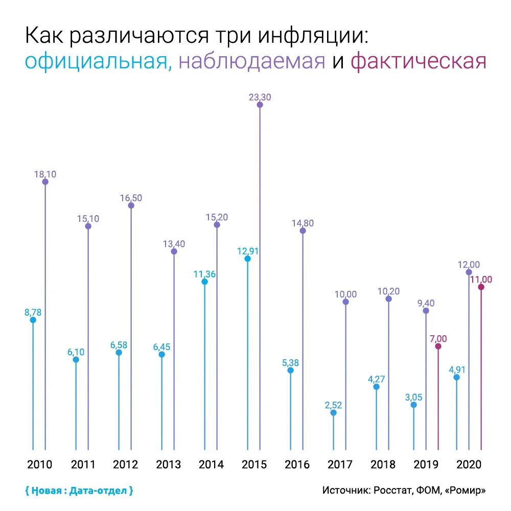 По ощущениям россиян, годовая инфляция в 2020-м и вовсе разогналась до 12%. «В жизни у каждого из нас — своя личная потребительская корзина, и она сильно отличается от среднестатистической по стране. Проблема большой разницы между ощущением инфляции и статистикой существует во всех странах», — говорит Наталья Орлова, главный экономист, руководитель центра макроэкономического анализа «Альфа-Банка».