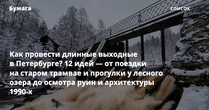 Подписывайтесь на рассылку «Бумаги» «Как провести выходные» — там мы также делимся идеями для досуга, а еще проводим розыгрыши и обмениваемся с вами впечатлениями от сериалов, подкастов и лекций.