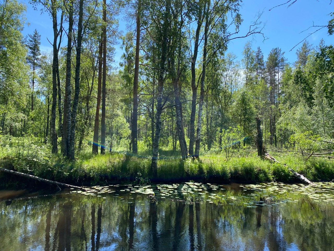 Маршрут проходит по сосновому лесу. По пути вам встретится лесное озеро Лебяжье с пирсом и беседками, болотистая речка Волчья и заросли черники. Можно прогуляться пешком или на велосипеде, народу не очень много. Обратите внимание, что в заказнике запрещено разводить костры, мусорить и ставить палатки.