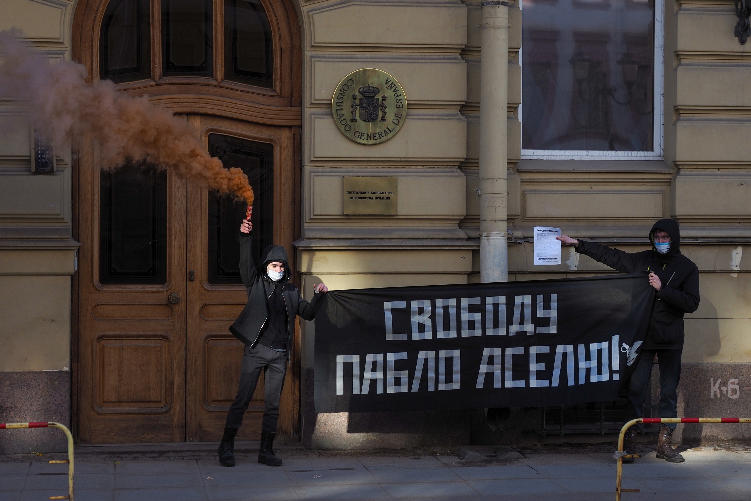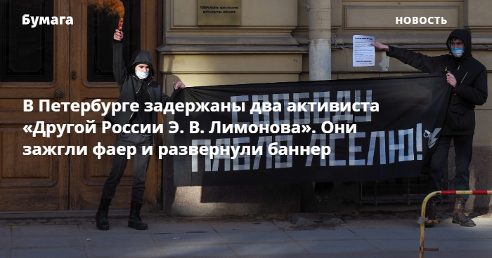 В Петербурге полиция задержала двух активистов «Другой России Э. В. Лимонова», которые развернули баннер в поддержку рэпера Пабло Аселя у испанского консульства. Об этом сообщается в соцсетях незарегистрированной партии.