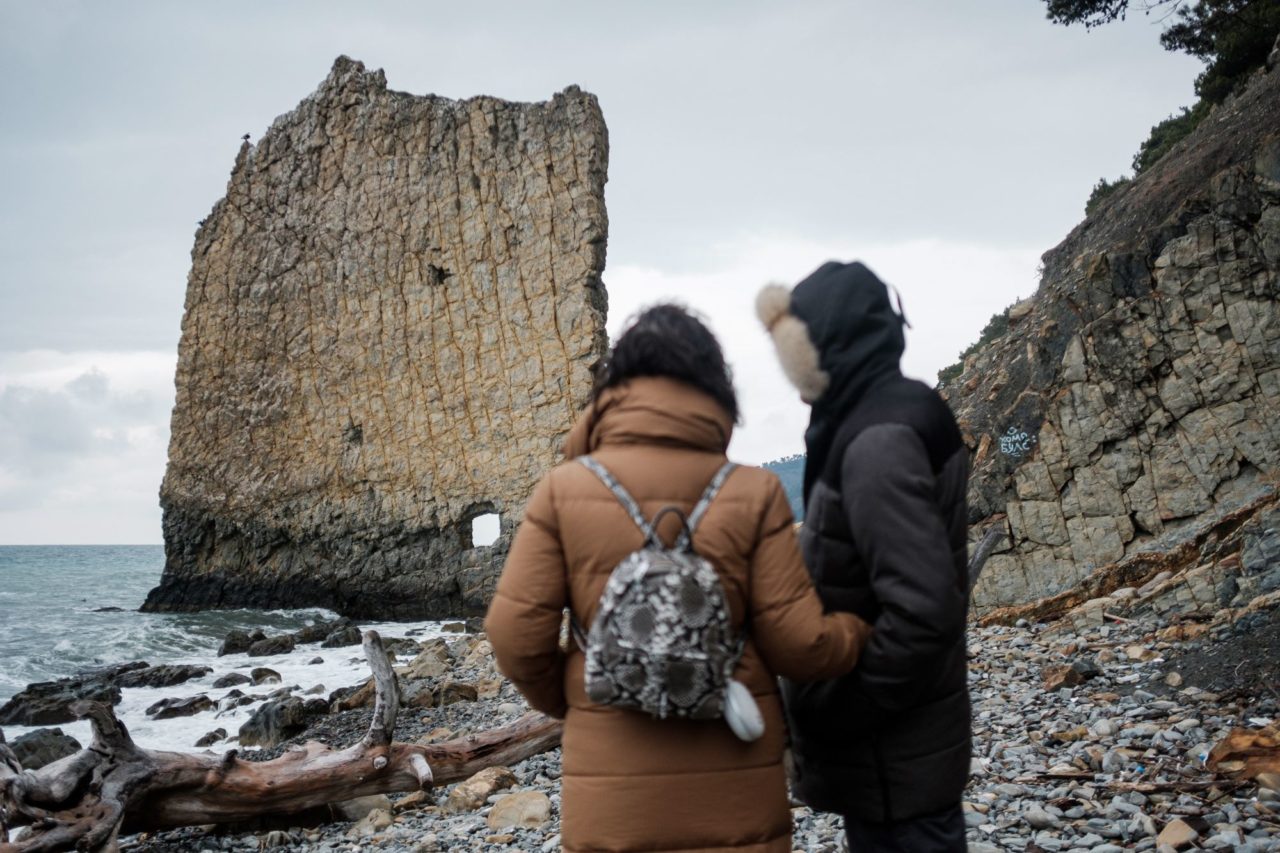 Туристы идут к главной достопримечательности Прасковеевки и всего Геленджика — скале Парус. Во время прилива проход туда затруднен. А в шторм и вовсе невозможенФото: Николай Хижняк для ТД При этом обнаженность не была обязательной. «Если человек хочет купаться в купальнике — кто ему это может запретить? Поржать над ним поржем — ха-ха-ха, “полосатым будешь ходить”. Но, как правило, на таких пляжах человек сам через три дня снимает с себя плавки и идет плавает», — утверждает Мария.