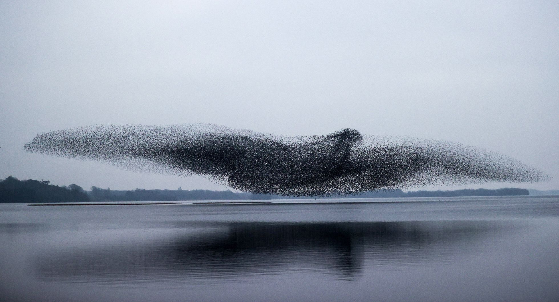 Тысячи скворцов сбились в стаю в форме огромной птицы — чтобы отпугнуть хищников. Фотография
