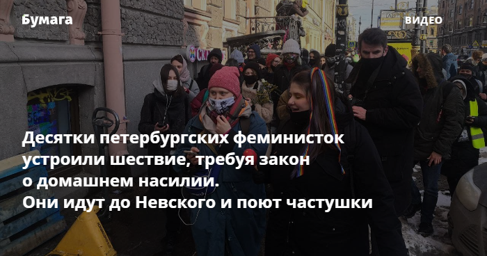 Днем 8 марта десятки феминисток устроили шествие от станции метро «Чернышевская» до Малой Садовой улицы. Видео с акции появились в телеграм-канале «ПЬЯTNIЦА».