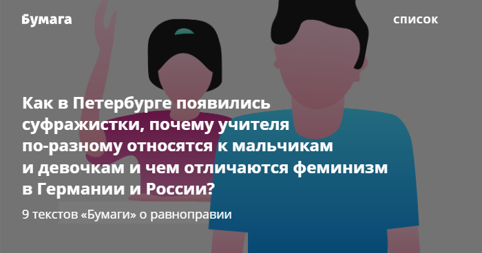 Праздник 8 Марта изначально появился как день солидарности женщин в борьбе за равные права и эмансипацию. В честь этого «Бумага» вспоминает девять текстов о феминизме, а также борьбе с сексизмом и гендерным неравенством. В них мы рассказывали, как в Петербурге зарождалось движение суфражисток, как измерить уровень сексизма в школах и почему общество в России не понимает, что такое харассмент.