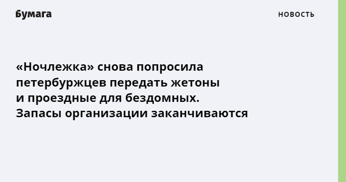 «Ночлежка» рассказала, что сейчас запасы жетонов и проездных «почти на нуле». Они нужны для передвижений бездомных, которые обратились за помощью: например, чтобы восстановить документы. «Петербург — огромный город, и, чтобы добраться до „Ночлежки”, людям часто нужно преодолевать большие расстояния», — написали в группе.