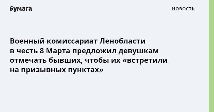 — Милые барышни, от имени военного комиссариата Ленинградской области позвольте вас поздравить с наступающим Международным женским днем, 8 Марта. Пусть всегда вас окружают настоящие защитники — не только родины, но и вас самих. А теперь позвольте преподнести вам небольшой подарок… Оставляйте в комментариях аккаунты ваших бывших, а мы их встретим на призывных пунктах. Настоящий мужчина должен иметь военный билет.