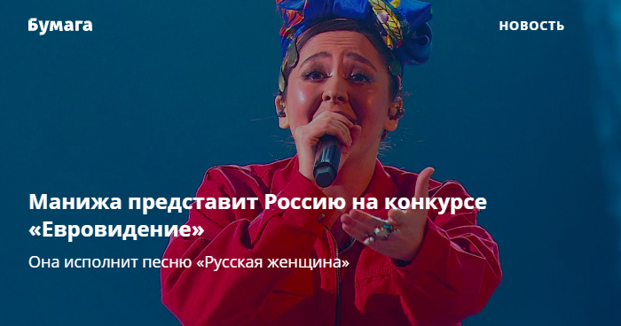 Манижа исполнит песню Russian Woman — «о трансформации самоощущения женщины за последние несколько столетий в России». «Я хотела бы, чтобы мир увидел нашу страну такой, какой ее знаю я: щедрой, открытой, яркой, ни на что не похожей», — сказала артистка. Свою победу в отборе девушка посвятила бабушке, которая верила в ее успех.