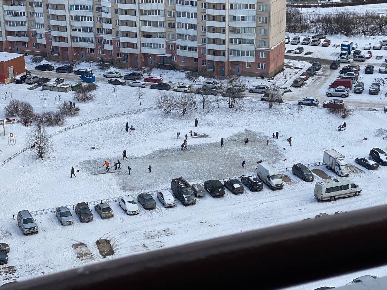Петербуржцы очистили от снега гигантскую лужу во дворе на Пулковском шоссе, чтобы кататься на коньках. «Бумага» показывает фотографию очевидца.
