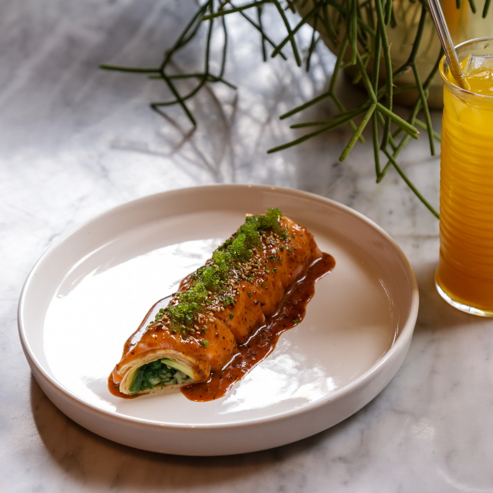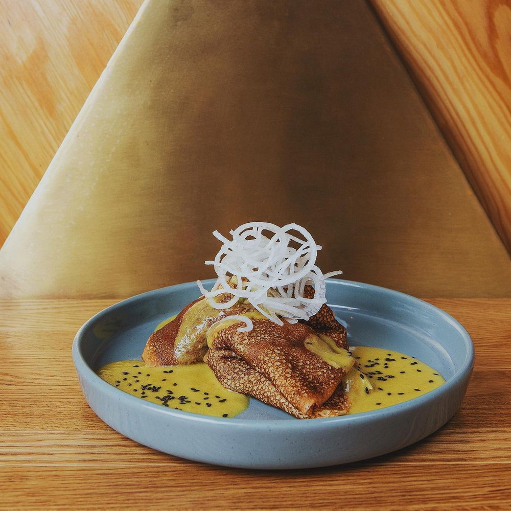 До конца недели в ресторане Made In China будут подавать пять праздничных блюд — например, блин с лососем и икрой васаби или блин-ролл с беконом и яйцами скрембл. На десерт посетителям предлагают два блинных торта: с матчей и мякотью маракуйи или с соленой карамелью и жареным пеканом.