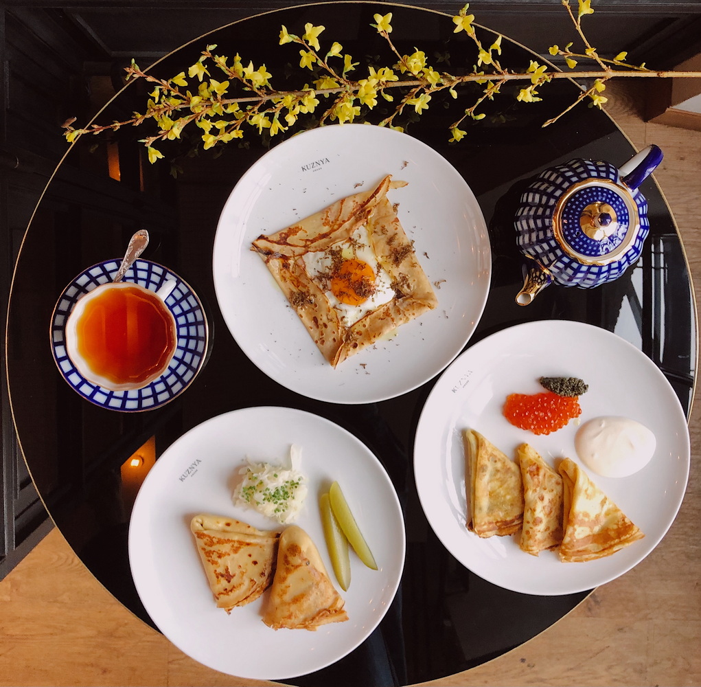 Шеф ресторанного пространства на Новой Голландии Руслан Закиров придумал масленичное меню, в котором классические блины — например, с красной икрой — встречаются с авторскими вариантами (попробовать стоит бретонский гречневый блин с сыром, ветчиной и трюфелем). Наиболее полное предложение действует в Kuznya House, некоторые позиции подают и в соседнем Kuznya Café. В выходные блины будут подавать на террасе: к ним предлагают глинтвейн или горячий напиток с алтайскими травами, медом и имбирем.