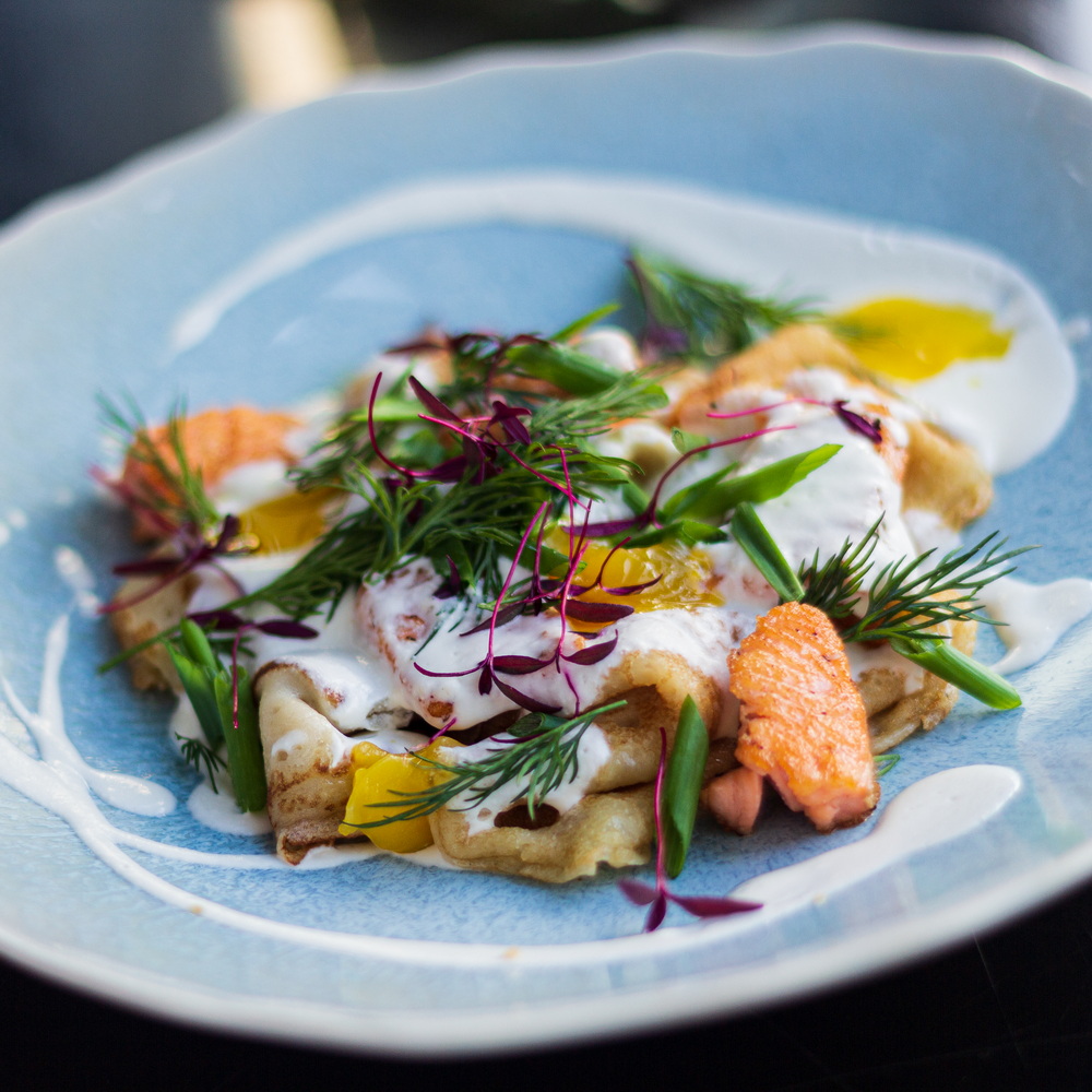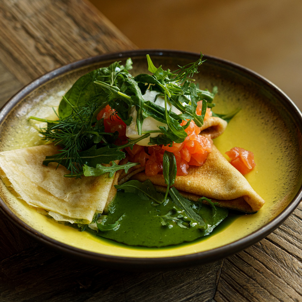 Шеф просторного ресторана в Ковенском переулке Михаил Кучма разработал для масленичной недели шесть блинов. В сытные позиции добавляют краба, окорок и лосось со страчателлой, в сладкие — заварной крем с клубникой, яблоко и кленовую карамель или лесные ягоды с мороженым. Гостям доступны и другие топинги по желанию: сопроводить главное блюдо недели можно, например, красной икрой или вишневым соусом.