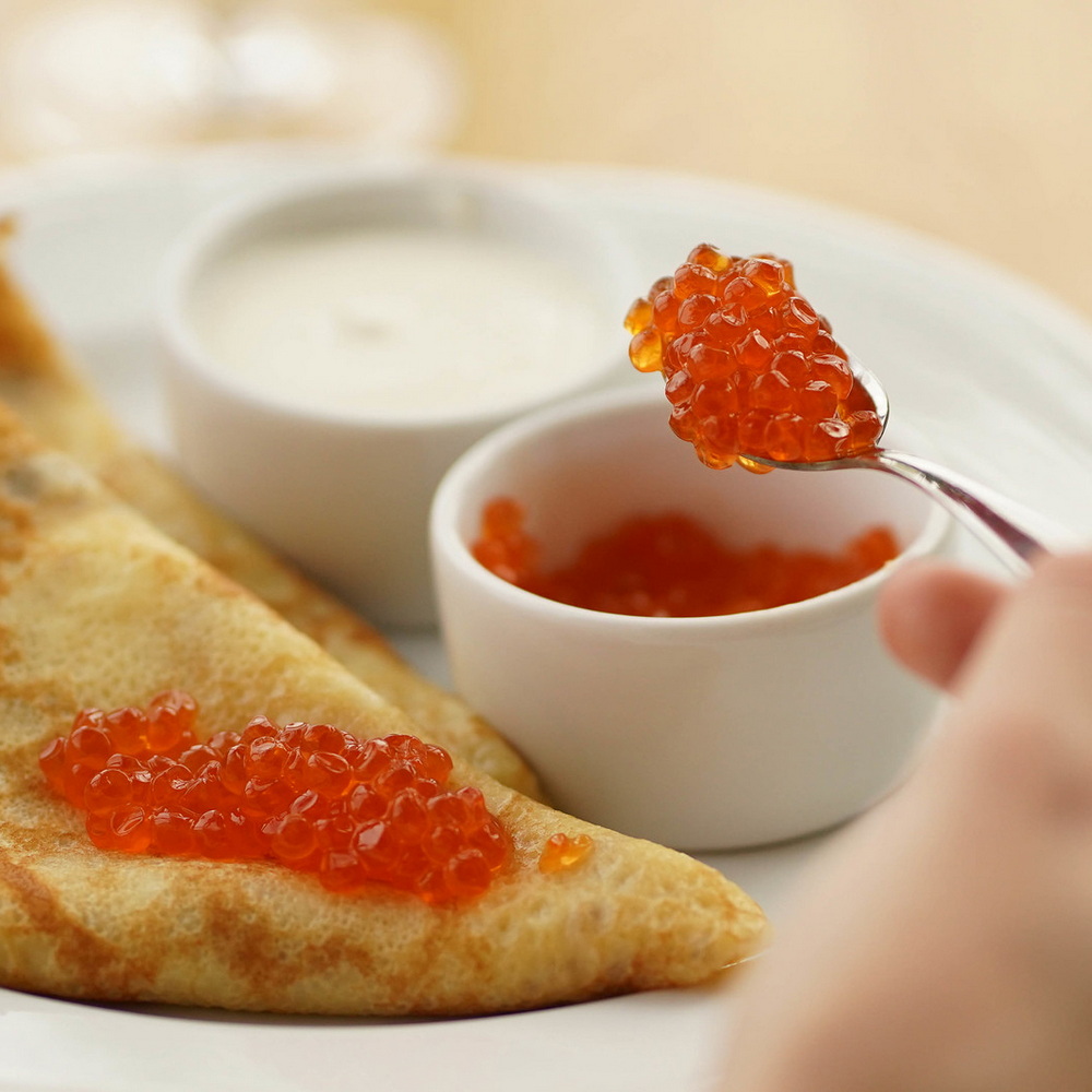 Итальянский ресторан Арама Мнацаканова на Петроградской стороне предлагает гостям вечную масленичную классику — блины со сметаной, а также красной или черной икрой. Блины сопровождают икрой Aram Mnatsakanov Selection, ее в Петербург поставляют из Вологодской области.