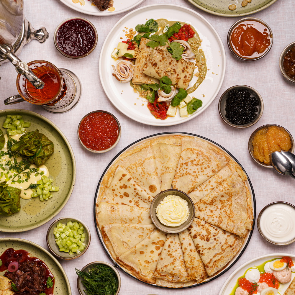 В ресторане по соседству с Дегтярными банями Станислав Левохо разработал более традиционное масленичное меню. Гости могут заказать блины со сметаной и красной икрой, а большим компаниям предлагают дюжину блинов с чаем из самовара. Авторские блюда тоже есть: черемуховые блины шеф сочетает с творогом и пьяной вишней, а кукурузные — с говяжьим мармеладом и брусничным соусом.