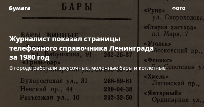 Журналист Андрей Захаров купил на Удельном рынке телефонный справочник за 1980 год с контактами заведений общепита Ленинграда. В нем упоминаются винные, пивные, молочные бары, котлетные и бульонные. «Бумага» показывает несколько страниц путеводителя.