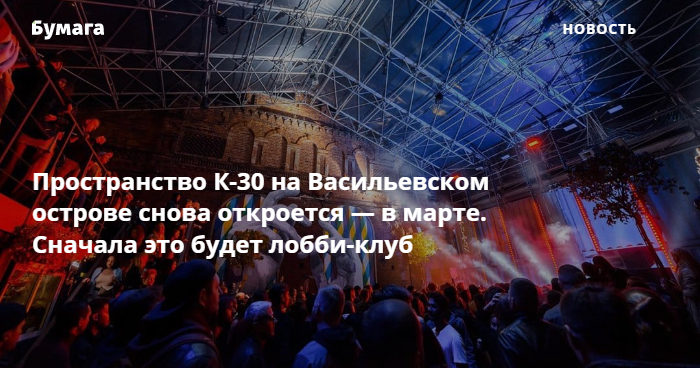 Пространство К-30 на Кожевенной линии, 30 от команды Roots United вновь открывается. Об этом сообщили в соцсетях.