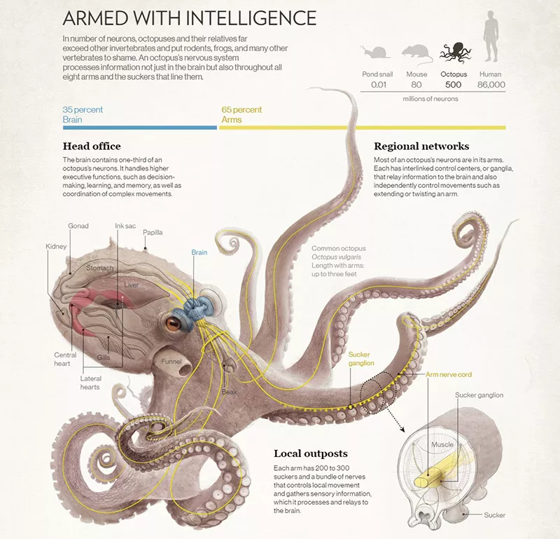 Тело осьминога находится под своего рода смешанным контролем. Его щупальца относительно автономны — они не только изучают мир на ощупь, но и чувствуют запах и вкус. Нервная система отдельного щупальца включает также нейропетли (рекуррентные связи), дающие конечности нечто вроде кратковременной памяти «на минималках». Даже ампутированное щупальце какое-то время способно действовать — скажем, вытягиваться или хватать.