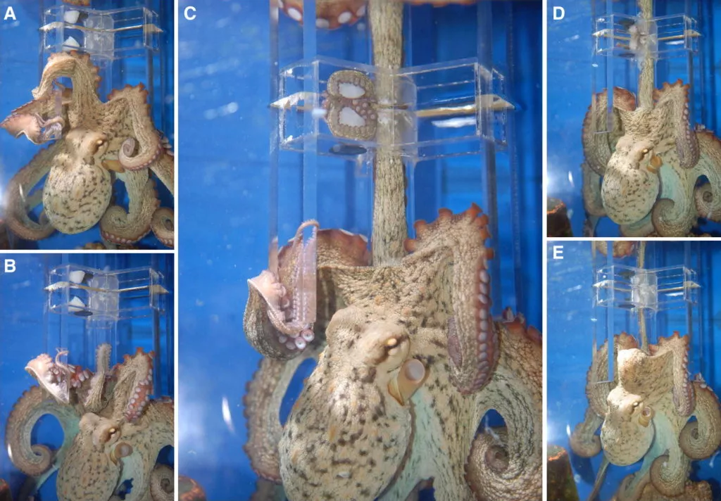 Израильский нейробиолог Биньямин Хохнер поставил эксперимент, в ходе которого щупальца осьминога лишили возможности добраться до еды с помощью своих рецепторов. А стены лабиринта, где проводилось испытание, сделали прозрачными. Не сразу, но осьминог все-таки смог направить щупальца в верном направлении, используя глаза.