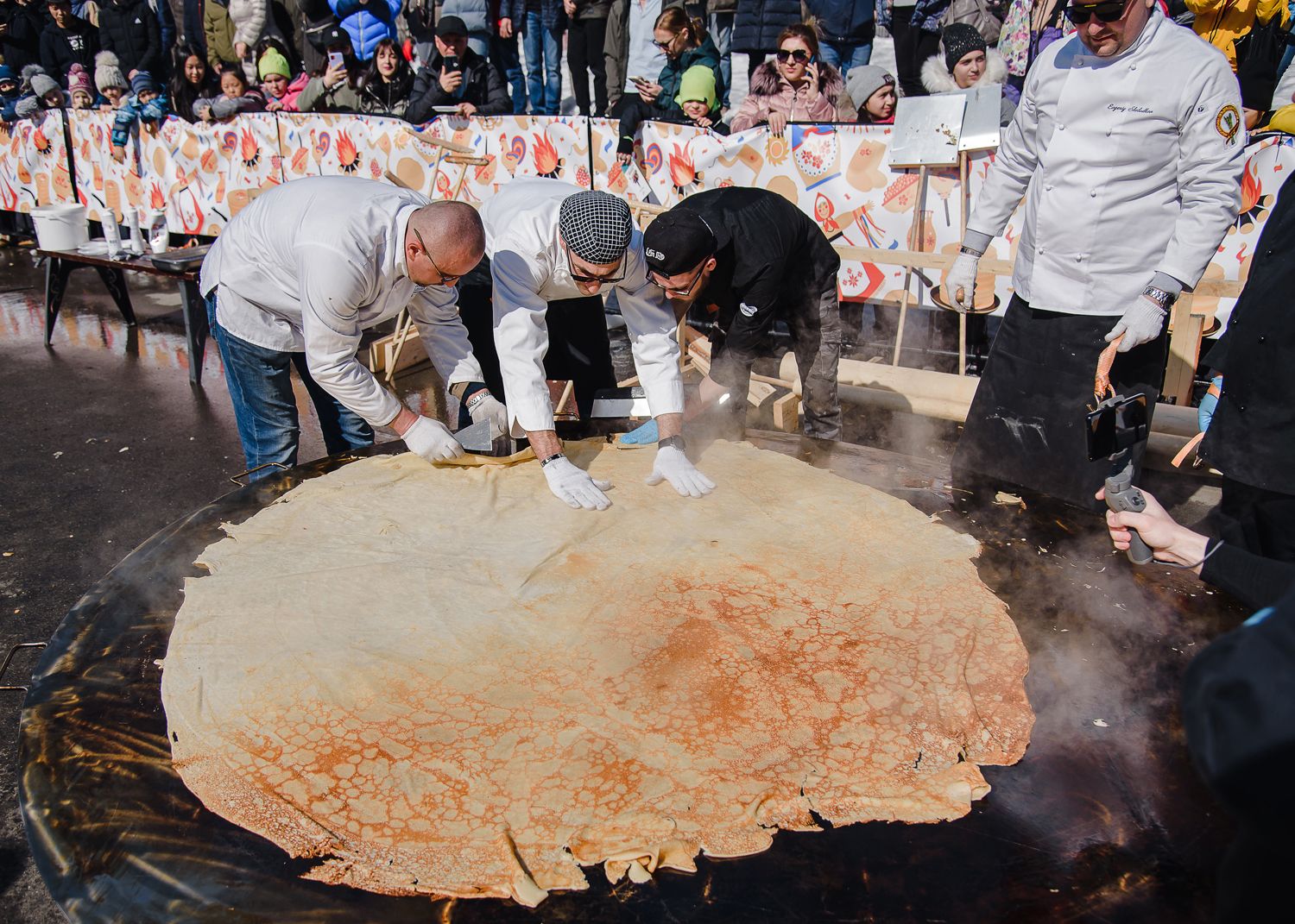 Традиционно не обошлось и без выпекания гигантских блинов — в Южно-Сахалинске их готовили на сковороде с диаметром 2,5 метра. Но кормили ими в этот раз не с лопат!