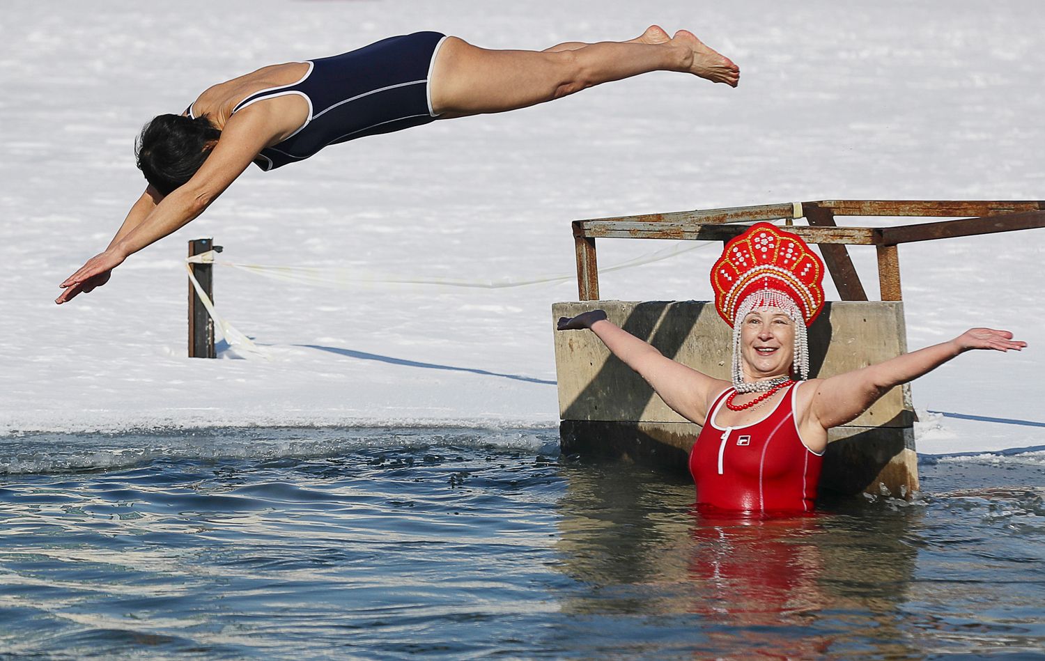 В Новосибирске группа любителей зимнего купания под названием «ОтморозкиН» решила отмечать Масленицу по-своему — заплывом в ледяной воде. Чтобы согреться, купались в кокошниках и шапках-ушанках!