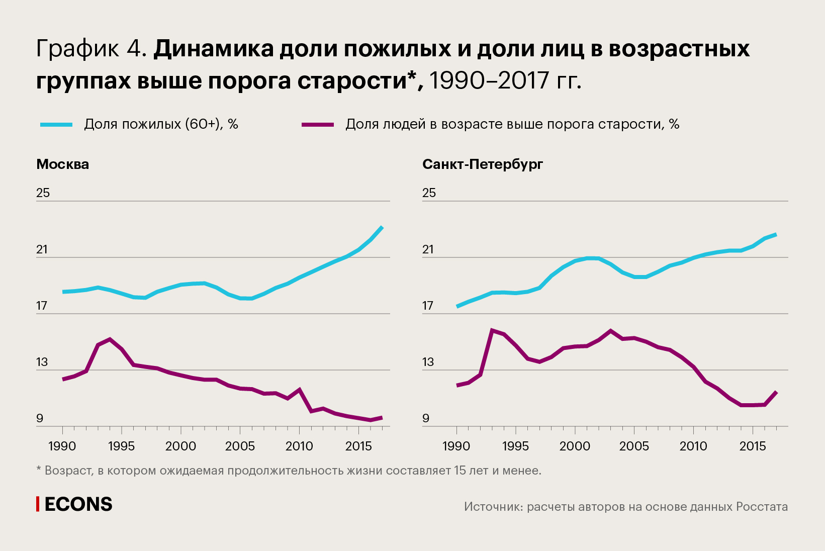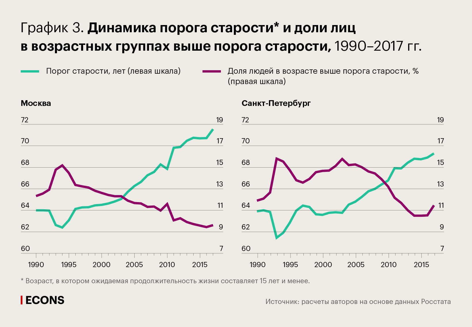 Порог старости для обоих полов в Москве, где ожидаемая продолжительность жизни выше, чем в Санкт-Петербурге, увеличился в 2017 г. до 71,6 года с 64 лет в 1990 г. В Санкт-Петербурге порог старости вырос к этому моменту до 69,3 года с 63,9 в 1990 г.
