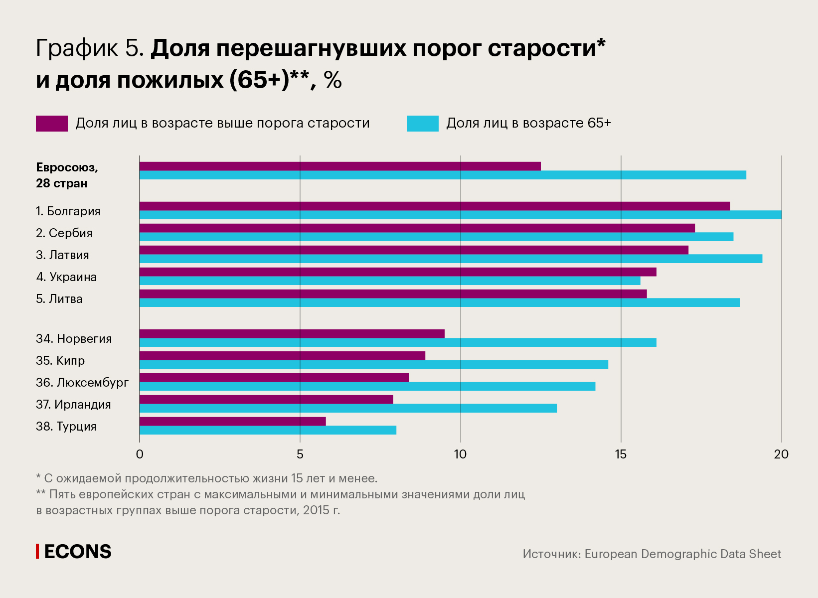 Данные по европейским странам также показывают ясную закономерность: доля пожилых людей, как правило, превышает долю населения в возрастных группах выше порога старости (график 5).