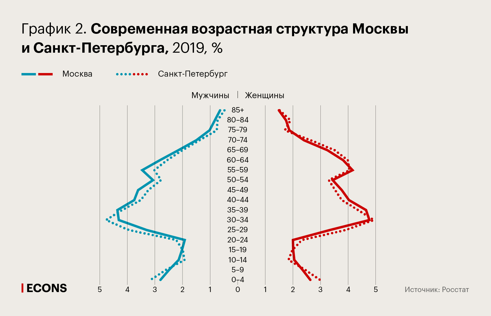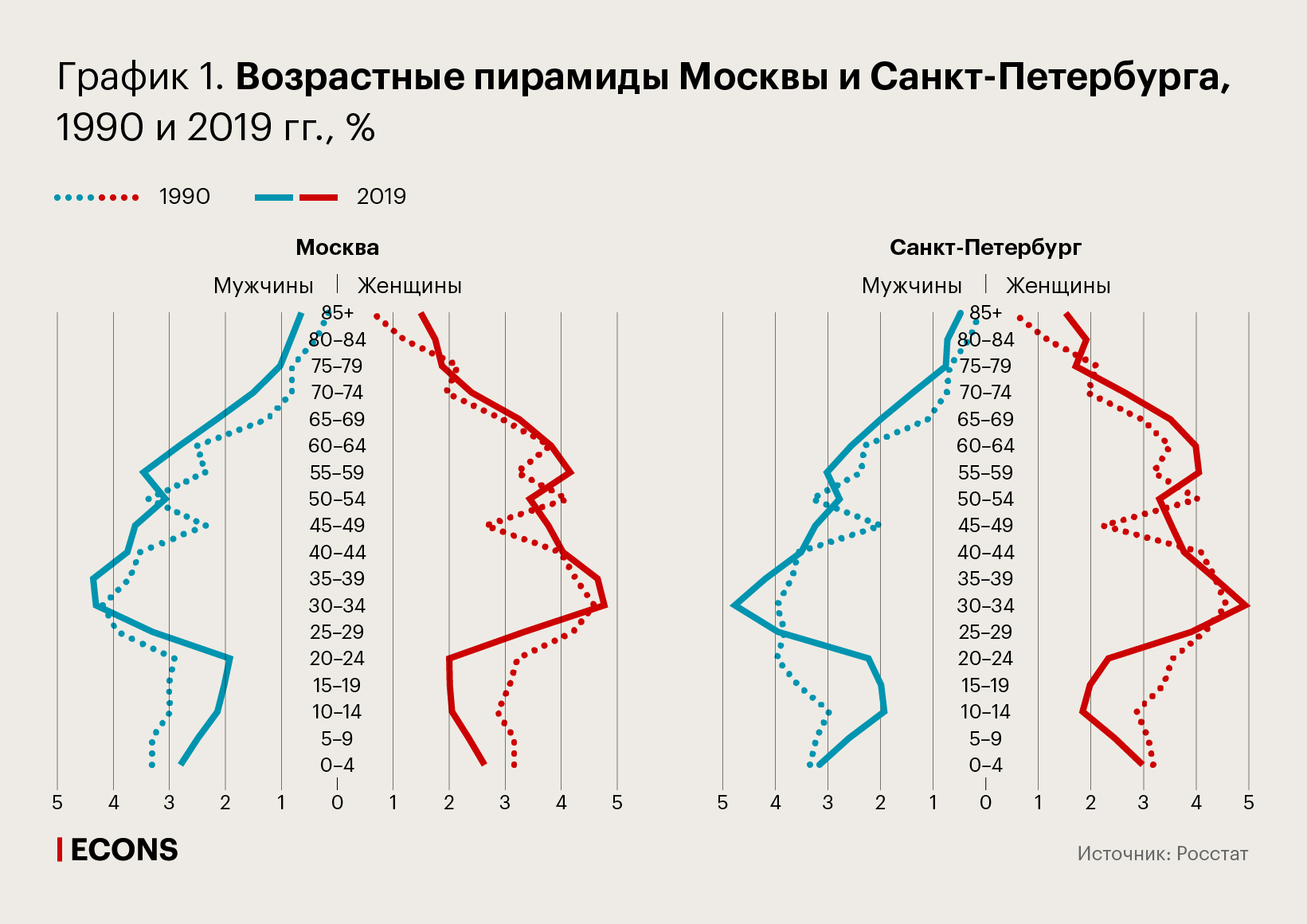 На графике 1 представлены возрастные пирамиды Москвы и Санкт-Петербурга в 1990 и 2019 гг., показывающие изменение возрастной структуры мегаполисов за почти тридцатилетний период: они демонстрируют увеличение верхней части возрастных пирамид обеих столиц, что означает демографическое старение. График 2 показывает значительное сходство современных возрастных структур Москвы и Санкт-Петербурга.