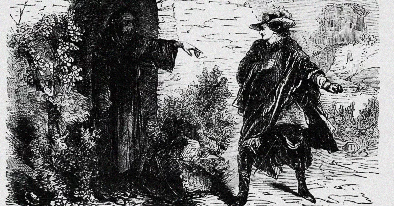 Было что-то странное в лице этого человека; путешественники не могли оставить его без внимания. Он был чрезвычайно высок и строен, с согнутыми плечами. Плащ закрывал нижнюю часть его лица, но, когда он поднимал глаза, склоненные на этот плащ, их взгляд был дик и страшен. <...> Еще несколько времени бродят англичане по старому собору и еще несколько раз видят загадочного незнакомца. Их любопытство, и вместе с тем любопытство читателя, затрогивается с редким искусством. Наконец автор, сжалившись над публикою, заставляет одного из англичан... [прерываю цитату, потому что не хочу спойлерить, — сами узнаете, если еще не знаете. — И. В.].