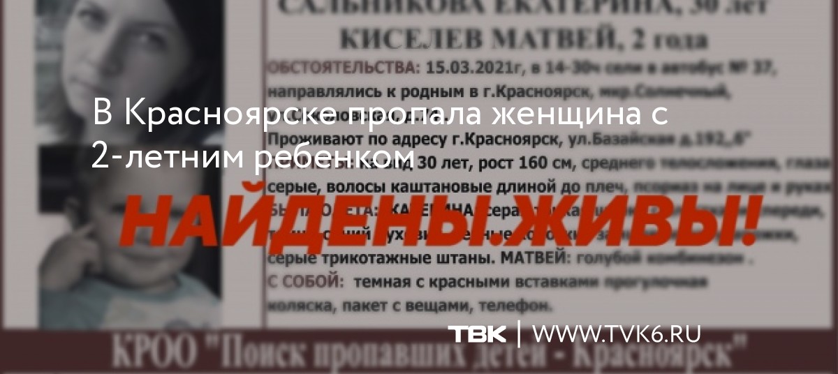 О пропаже красноярки Екатерины Сальниковой с 2-летним сыном сообщили в волонтерской организации «Поиск пропавших детей». 15 марта 30-летняя женщина с сыном поехала к родным в мкрн. Солнечный на ул. Соколовская, 74. Последний раз ее видели на конечной остановке «Базаиха» около 14:30–15:00. Известно, что они выехали из дома на ул. Базайская, 192Б, на автобусе №37. Сейчас местонахождение красноярки с ребенком неизвестно.