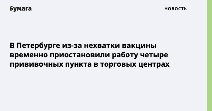 «Бумага» направила в комитет здравоохранения запрос о причинах временного закрытия прививочных кабинетов в остальных торговых центрах, но не получила оперативного ответа. «Петербургский Дневник» сообщает, что пункты приостановили свою работу из-за недостатка первого компонента вакцины.