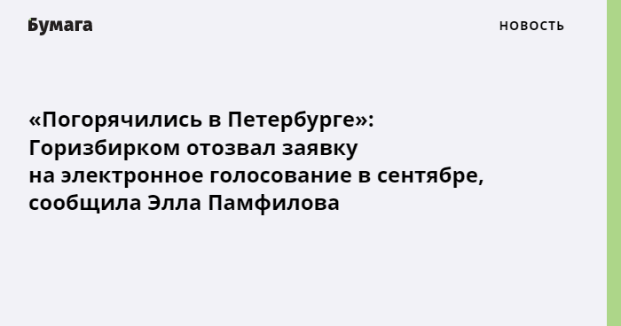 Горизбирком Петербурга отозвал заявку на проведение электронного голосования на выборах в сентябре. Об этом сообщила глава Центризбиркома Элла Памфилова, ее слова приводит ТАСС.
