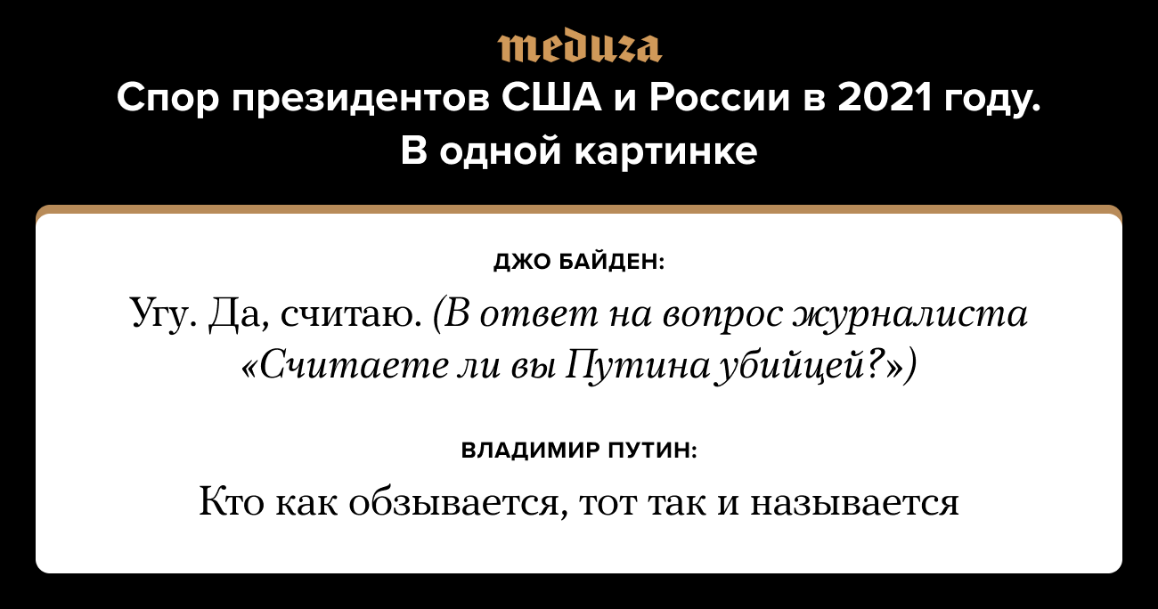 - А сам Путин пожелал Байдену здоровья — «без иронии, без шуток». И добавил: «Кто как обзывается, тот так и называется». А позже предложил открытую дискуссию в режиме онлайн