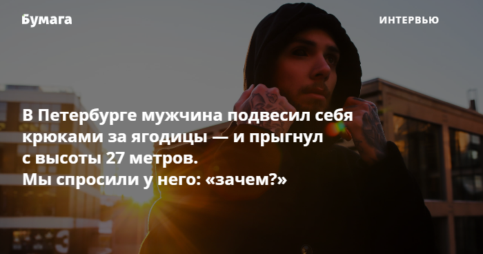 В середине марта в инстаграме распространилось видео, на котором мужчина прыгает с высоты 27 метров — его якобы удерживают лишь крюки в ягодицах. «Бумага» выяснила, что это был московский бариста и модель с псевдонимом Аид Адов. Он специально приехал в Петербург: это был его второй экстремальный прыжок и четвертое подвешивание. Он считает, что стал вторым в мире человеком, который спрыгнул с большой высоты, подвесившись за ягодицы.