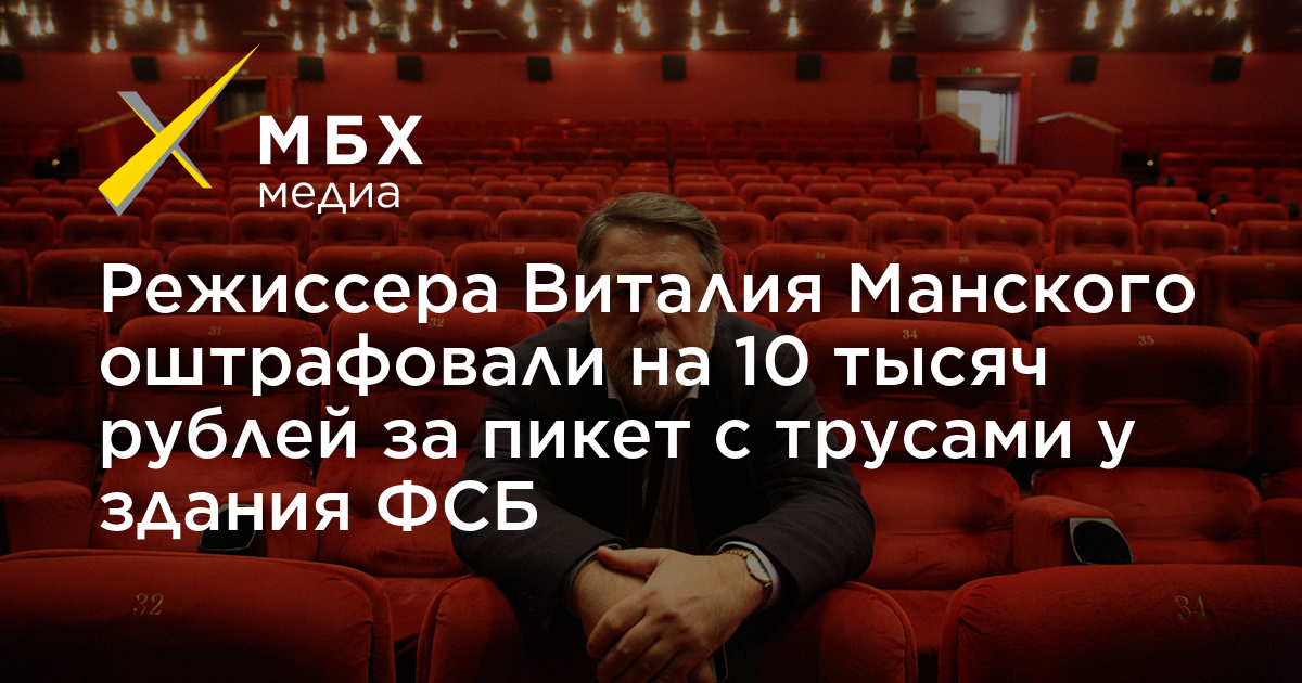 Мещанский районный суд Москвы оштрафовал режиссера Виталия Манского на 10 тысяч рублей за пикет с трусами у здания ФСБ. Об этом «МБХ медиа» сообщила юрист «Правозащиты Открытки» Алена Борисова.