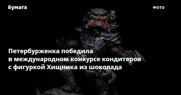 Петербурженка Татьяна Холодцова победила в международном конкурсе Cake International в номинации «декоративные статуэтки». Она изготовила детализированную фигуру Хищника из пластичного шоколада. «Бумага» показывает работу кондитера.