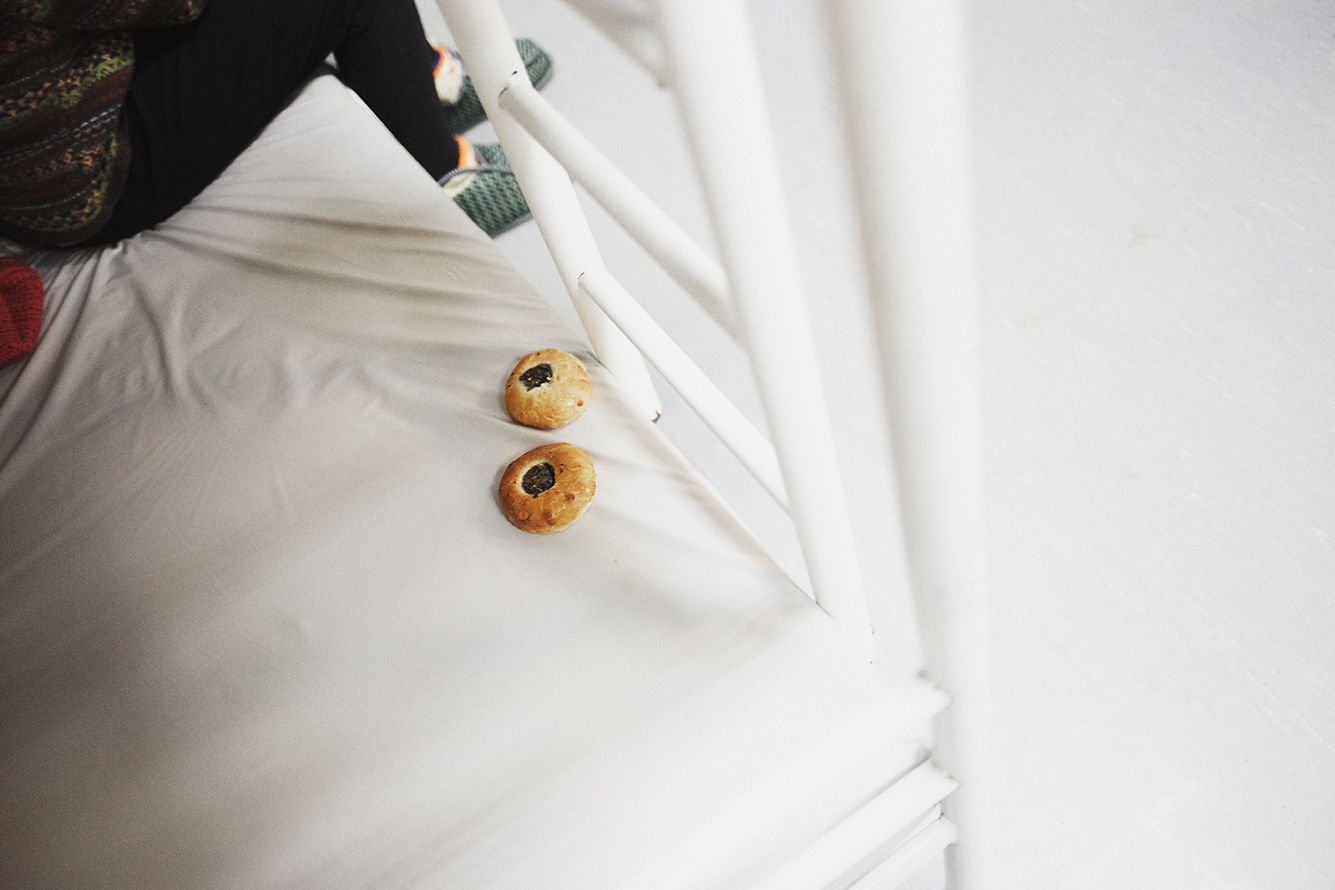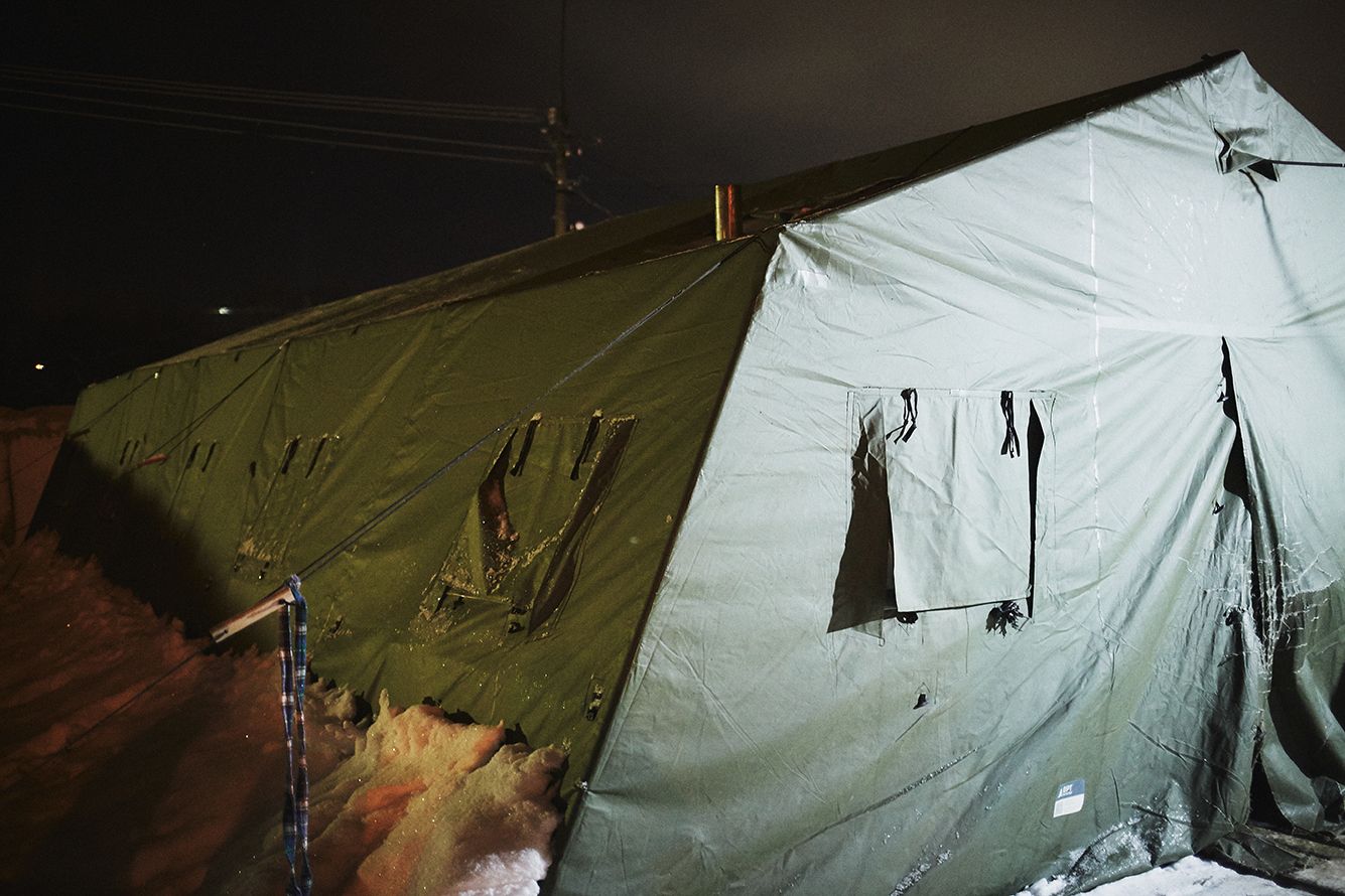 В какой-то момент Саша находит на снегу свои следы, ведущие к забору кладбища Памяти жертв 9 января, и сворачивает туда. Пролезаем с ним под забором, пробираемся сквозь ветки. Саша не привык водить гостей, поэтому ветки за собой не придерживает — позади него они отстреливают в лицо. Пройдя пару метров, он внезапно говорит, что мы уже у него дома. На снегу лежат мандарин, пара пластиковых бутылок, бежевое тонкое одеяло, накрытое черной тканью — ею Саша укрывается. Конструкцию своего дома он называет «палаткой».