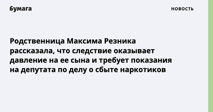 Художница Лиза Михайлова, дальняя родственница депутата Закса Максима Резника, заявила, что следствие оказывает давление на ее сына Ивана Дорофеева и требует показания на парламентария. Ранее Дорофеева задержали по делу о незаконном сбыте наркотиков. Об этом Михайлова рассказала на своей странице в фейсбуке со ссылкой на адвоката Тимура Рзаева.