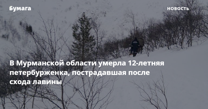Вечером 22 марта туристическая группа из Петербурга попала под сход лавины, под снегом оказалось несколько подростков. Девочку искали дольше остальных. Сначала она была в тяжелом состоянии, для ее эвакуации направили вертолет, но медики добрались до лагеря раньше и констатировали смерть. Девочка занималась спортивным туризмом 4 года, у нее был разряд.