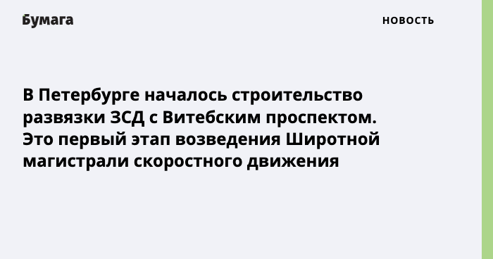 В Петербурге началось строительство транспортной развязки Западного скоростного диаметра (ЗСД) с Витебским проспектом и Широтной магистралью скоростного движения (ШМСД). Об этом сообщают «РИА Новости».